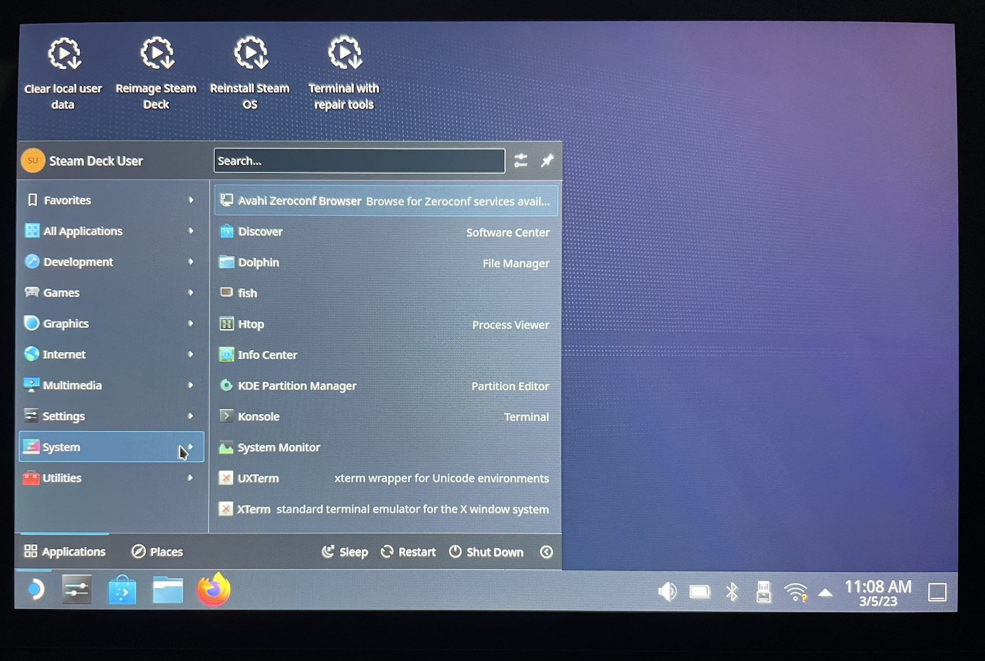 - Tiếp đó bạn nhấn vào biểu tượng steam deck ở góc trái phía dưới màn hình, chọn System -> KDE Partion Manager.