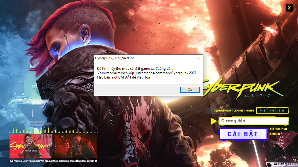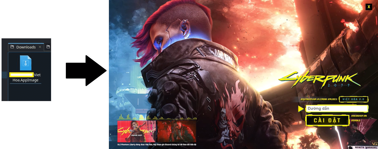 Khác với các hướng dẫn việt hóa trên Steam Deck khác, REDshop.vn đã đầu tư hẳn bộ cài hoàn chỉnh dành riêng cho Steam Deck. Người dùng chỉ việc tải bản path về, giải nén ở bất kỳ thư mục nào và chạy file Cyberpunk2077_VietHoa.AppImage để mở giao diện bộ cài.